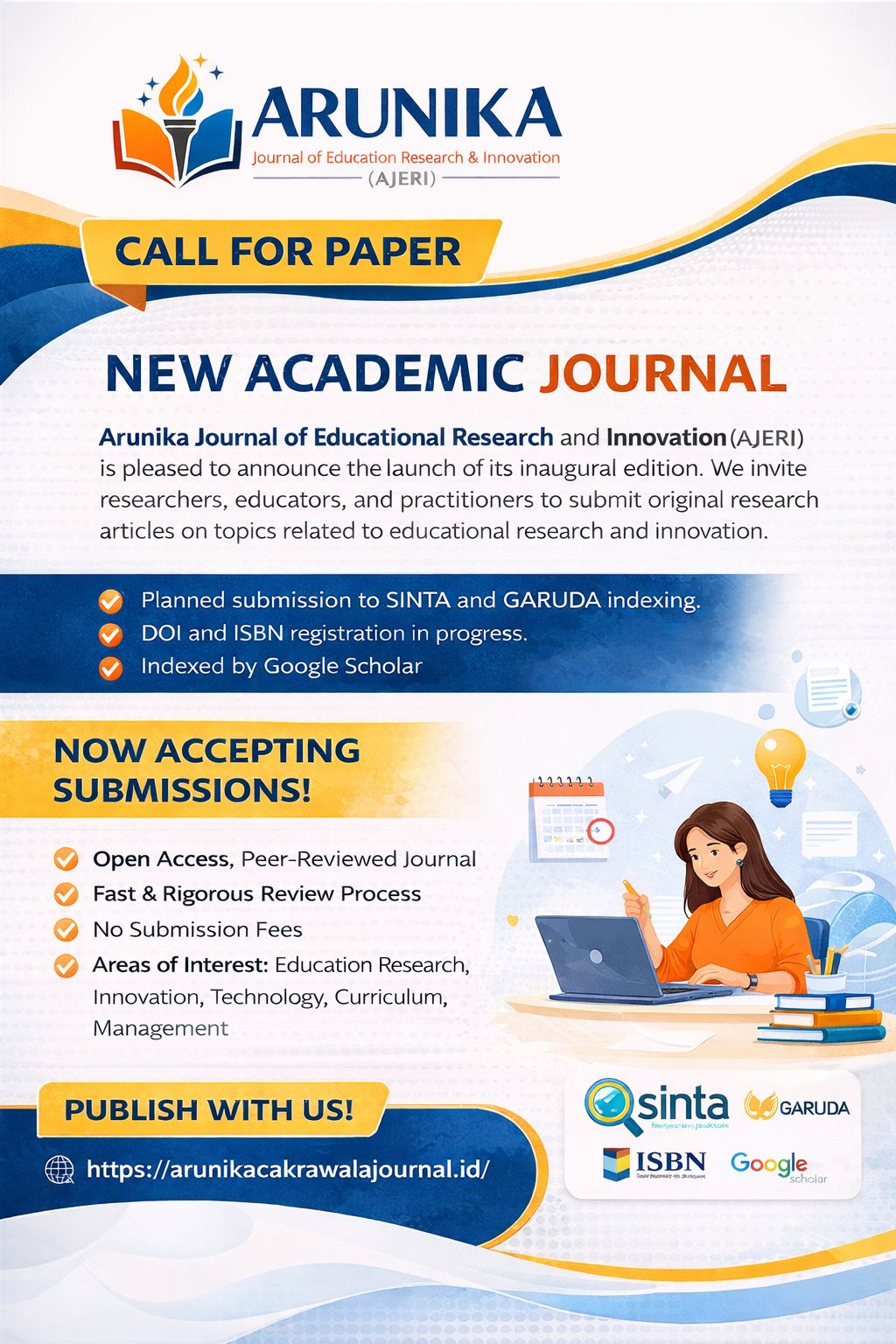 Arunika Journal of Educational Research and Innovation (AJERI) invites researchers, academics, teachers, and practitioners to submit high-quality manuscripts in the field of education. AJERI is a peer-reviewed, open-access journal committed to promoting research-based innovation and advancing educational theory and practice.
